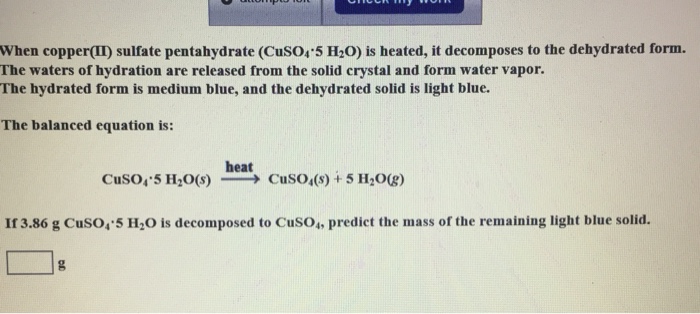 CuSO45 H2Os ------- CuSO4s 5 H2Og If 242 g CuSO45 H2O is decomposed to CuSO4 predict the mass of the remaining light blue solid in grams. Use EXTREME CAUTION when you are near an open flame Materials. That hydrogen bonding is broken while we heat the compound.